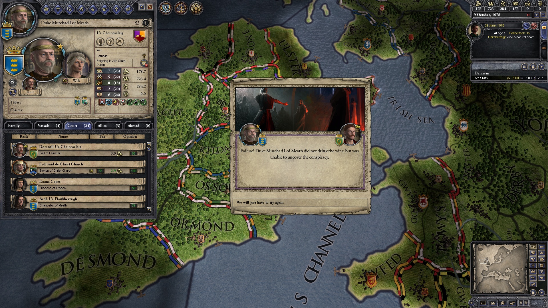 In my first 1.07 game as Dublin, I gave Leinster to my firstborn son to prevent a breakup upon my death with gavelkind succession. After I gave him the county he had positive 82 relations with me. Less than 1 month later, my spymaster discovered that this very son was plotting to kill me. Said spymaster was subsequently murdered on the orders of my son. My son would not end his plot (the only modifiers it gave were -2 for base reluctance.) I was regularly checking the intrigue page and to my knowledge it never showed any backers. The plot event fired anyway and now I'm dead and my son has inherited the Duchy of Meath and the County of Dublin from me. Someone informed on him, so he has the kinslayer trait.