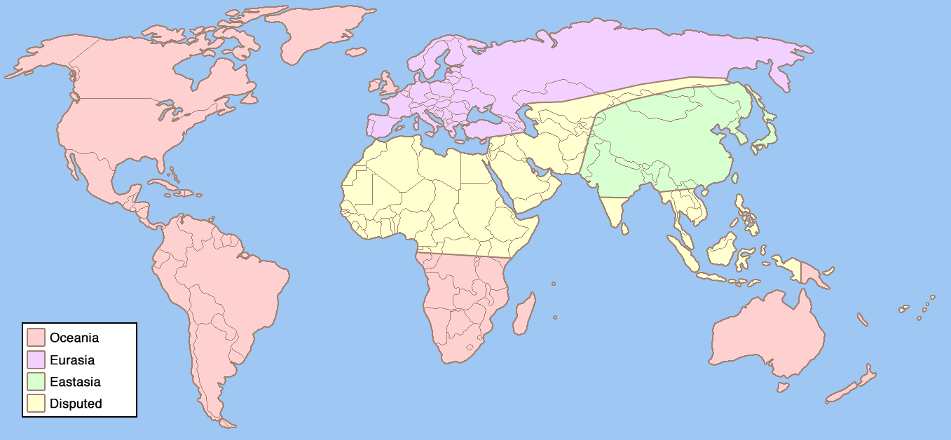 Approximate tie between Oceania and Eurasia, with Eastasia lagging behind.