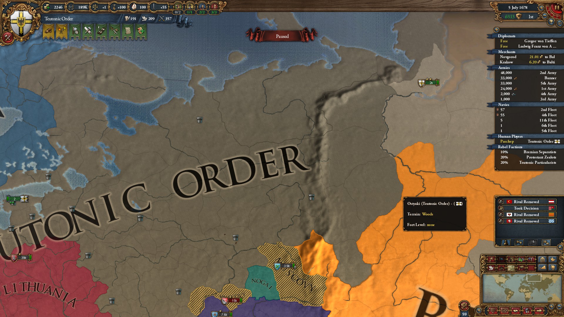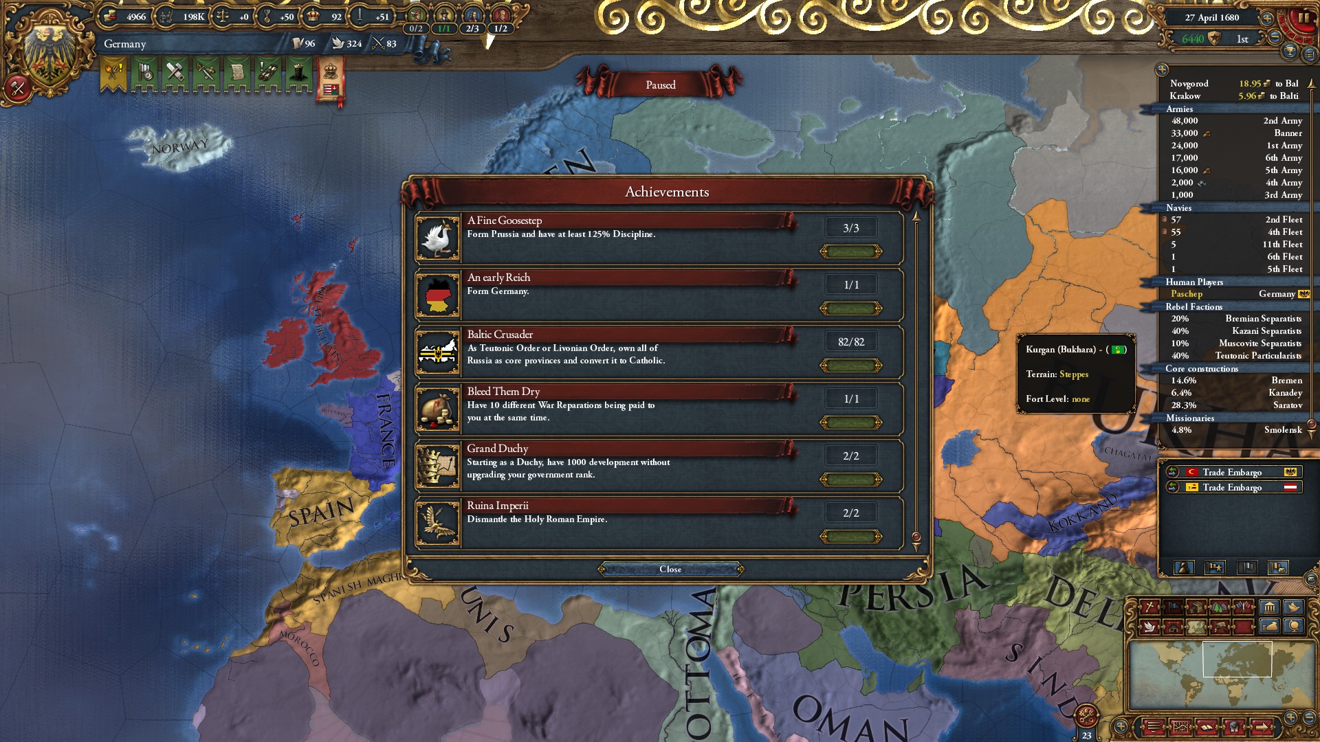 In my recent campaign I wanted to get Grand Duchy, Ruina Imperii, Baltic Crusader, A fine Goosestep and An early Reich playing as the TO. I think that I have conquered all of Russia and Crimea and converted it to Catholic.