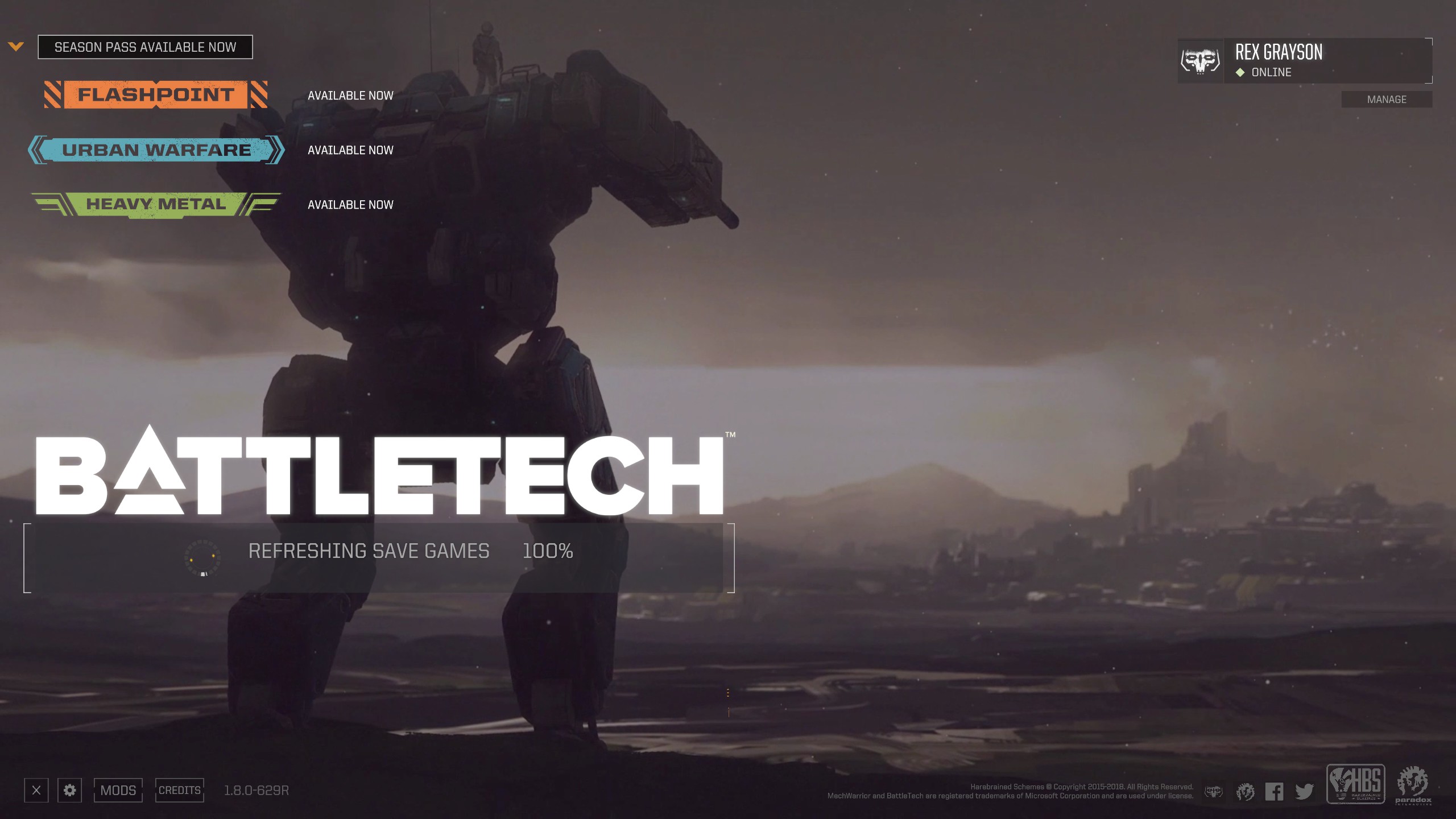 Just finished installing Heavy Metal patch 1.8 and the title screen is continuously showing "Refreshing saved games 100%" where the buttons to chose a game type and load saved games are normally found.
