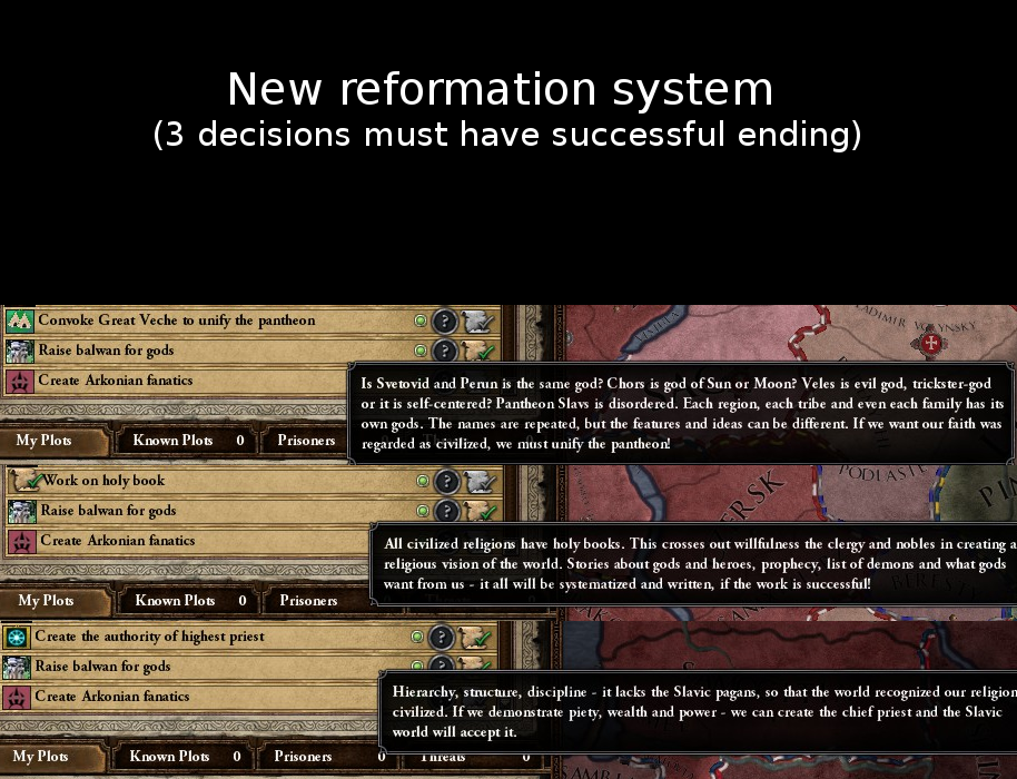 Defenders of pagans have very weak content. Reformation was based on imperialism and great conquests. Everything was flat and bland. So I, and my co-worker, started work with mod for slavic pagan world.First problem was lore. Historical concepts were very different. Some historians have said that Slavic paganism did not exist at all and that the Slavs were atheists at all. Others say it was paganism like a Greek only barbaric and with other names. Still others wrote pseudoscientific theories of cosmic origin. So it was usually a boring or senseless lore. Finally, I found the concept of "cooperation of dualism". In brief - there are good and evil forces; as alone forces are too weak so must work together. Therefore was eg. in Polish there is a saying "Bogu świeczkę, diabłu ogarek" (candle for God, taper for Devil; latin equivalent uni sacrificio, ut prosit, alteri, ne noceat). For similar reasons the Teutonic Knights accused the Slavs of being evil Christians (to them it was the sacrifice for devil).
