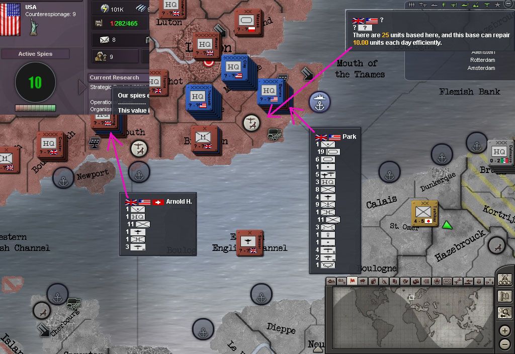 A clear proof is the over-stacking of the air fields in Dover. They clearly have not had the time to sort this mess out after losing all the air bases in the Ruins of France. The German Commander of the East has suggested a couple of V2s on the air fields of Dover just to make things a little bit trickier for the cursed Allies. Radar is showing that most of the British air fields are more or less full (and old reconnaissance remember lvl 10 fields up north being over stacked with old Polish planes).