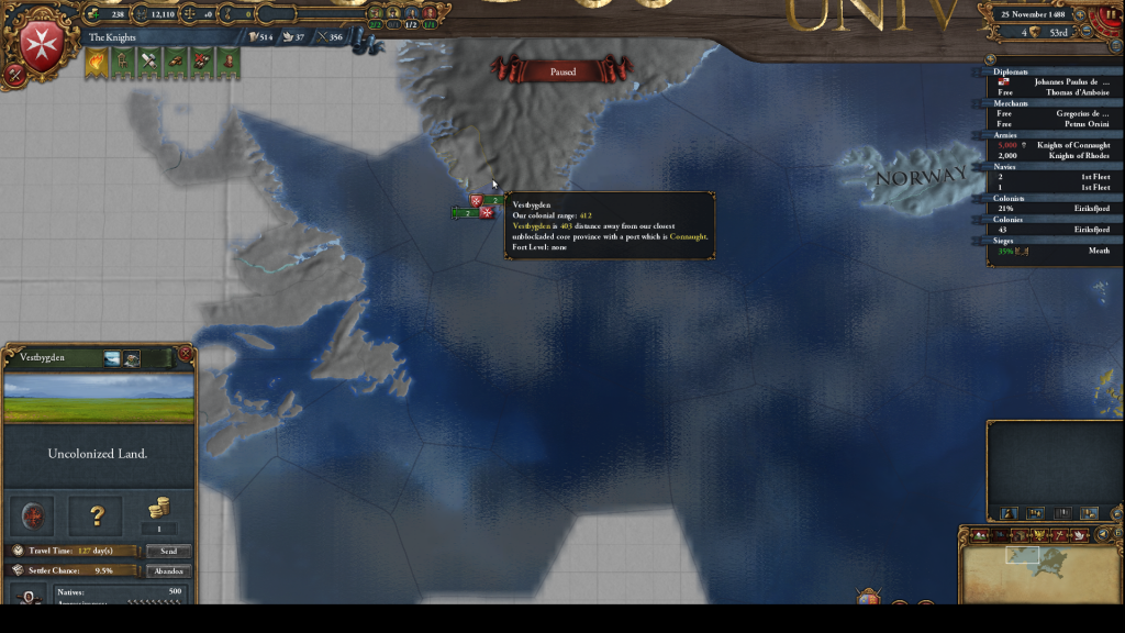 - Declare on one of the Irish minors. Get Connaught, diplo tech 7, and the 3rd exploration idea. This gives you 412 colonial range. The two island provinces in Greenland are 407 and 403 from Connaught respectively.