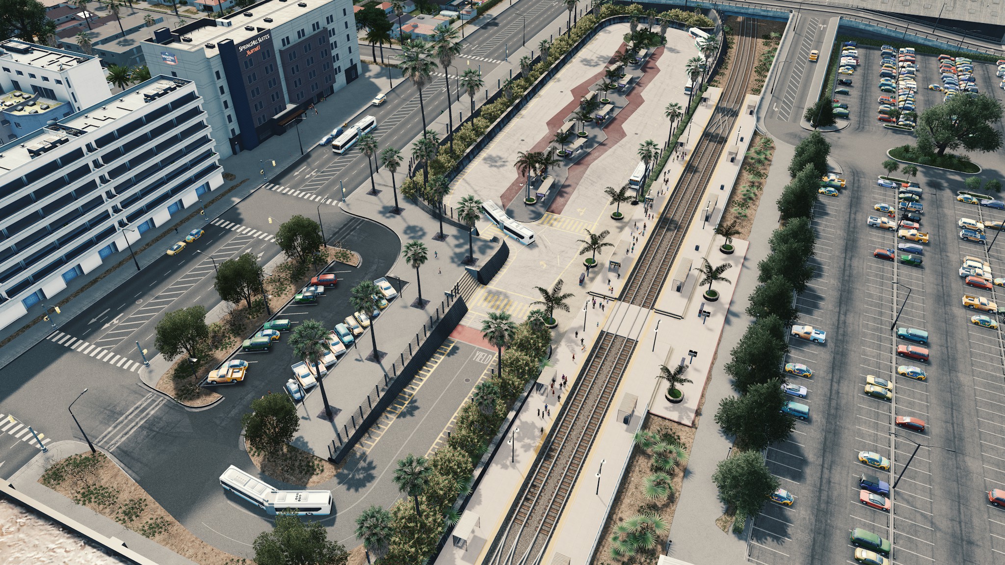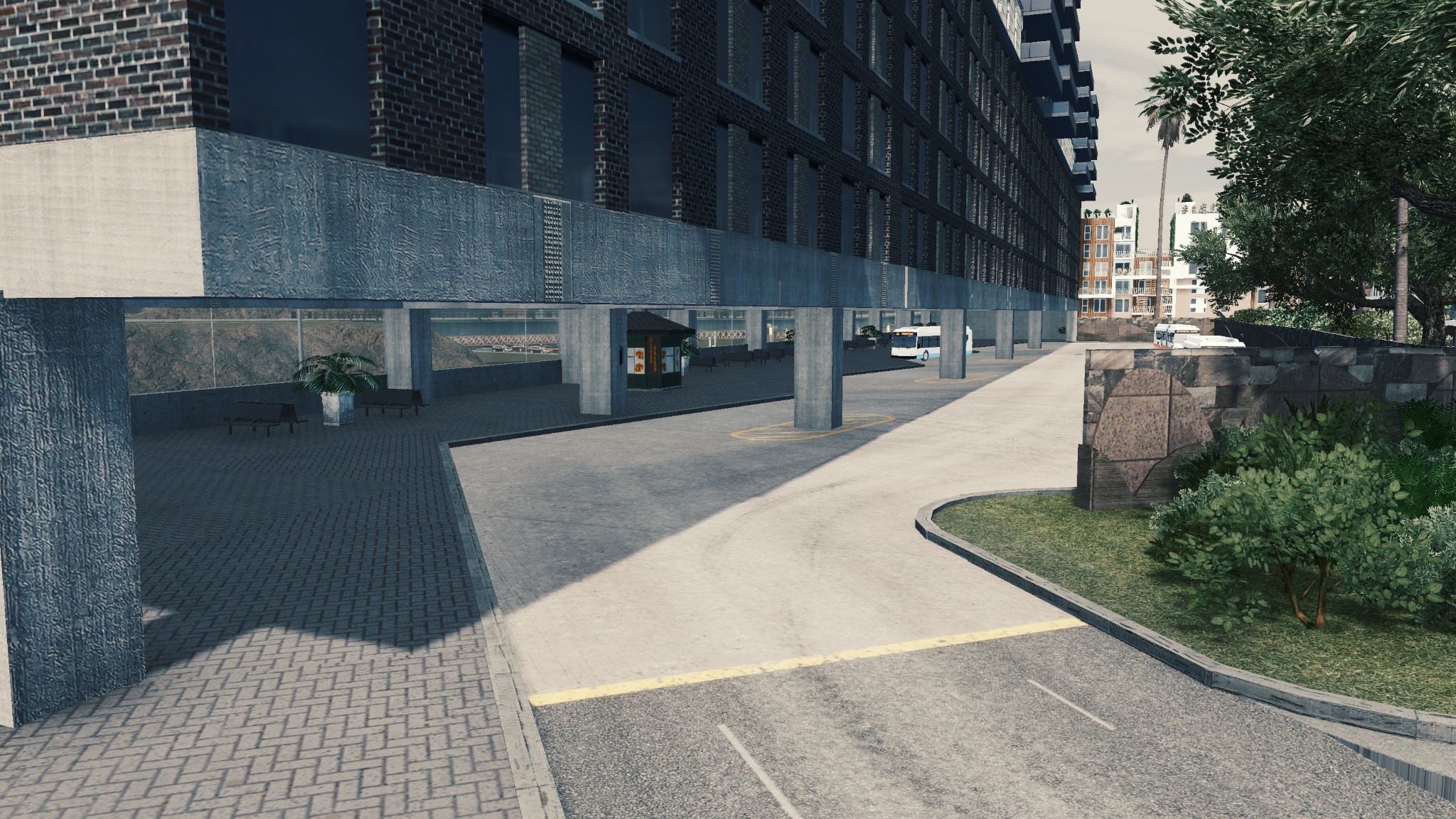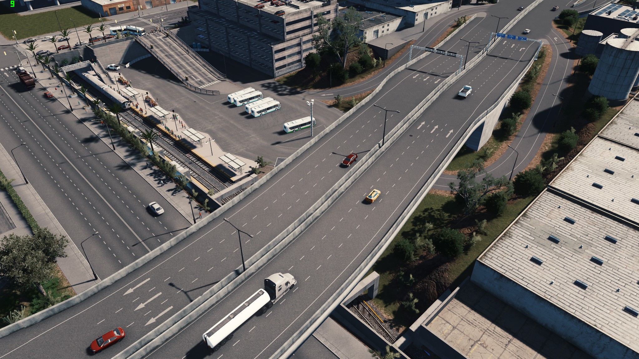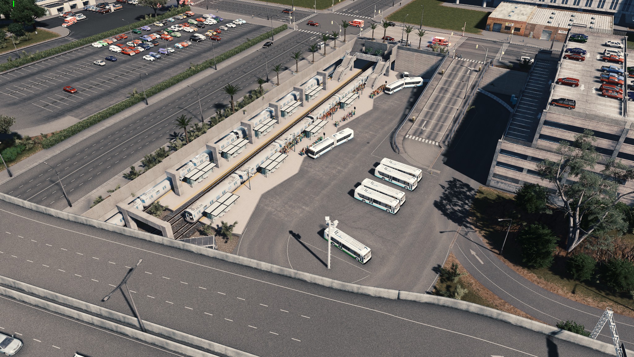 Starting to work a bit on some of the downtown areas. First up is the part which is now a gap towards the southern finished suburbs. This includes a partly covered metro station and a bus terminal with direct access to the highway: