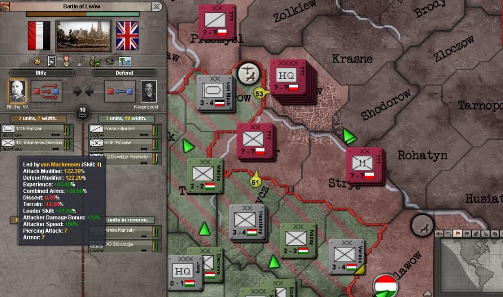 Initially, the Polish defense south of Lwow seemed strong for the force the Obercommando had deployed in Hungary, especially as the Hungarian divisions just initiated their mobilization-process and were at some 20% strength only. Nevertheless, von Mackensen’s 11th Panzer had been pushing through the Polish infantry and reached the gates of Lwow. He awaited support of the 15th Infantry division before the attack was commenced on the key city.