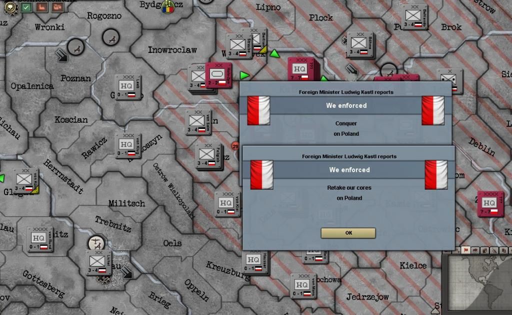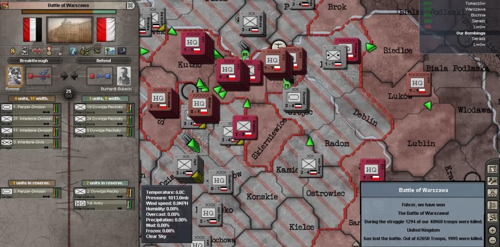 Authors note: Poland fell before Warszawa had fallen. Thus, my initial plan worked. Due to Zid being away and the Polish forces exped to UK, they remained and the Battle of Warszawa actually continued until the 19th. Sir Henry playing UK disbanded all Polish units not engaged in battle but a few HQs had to be attacked in order to disappear.