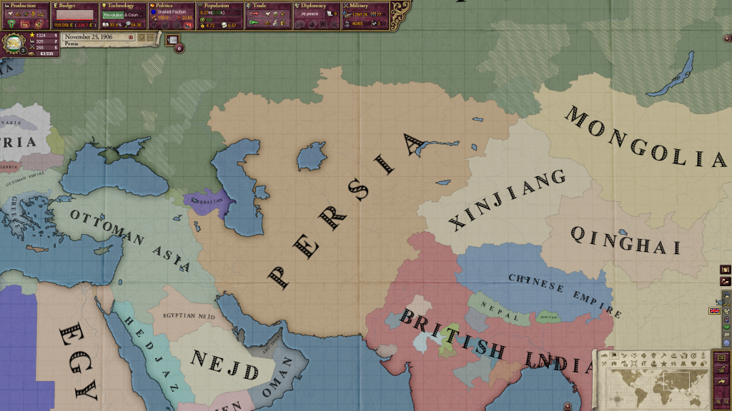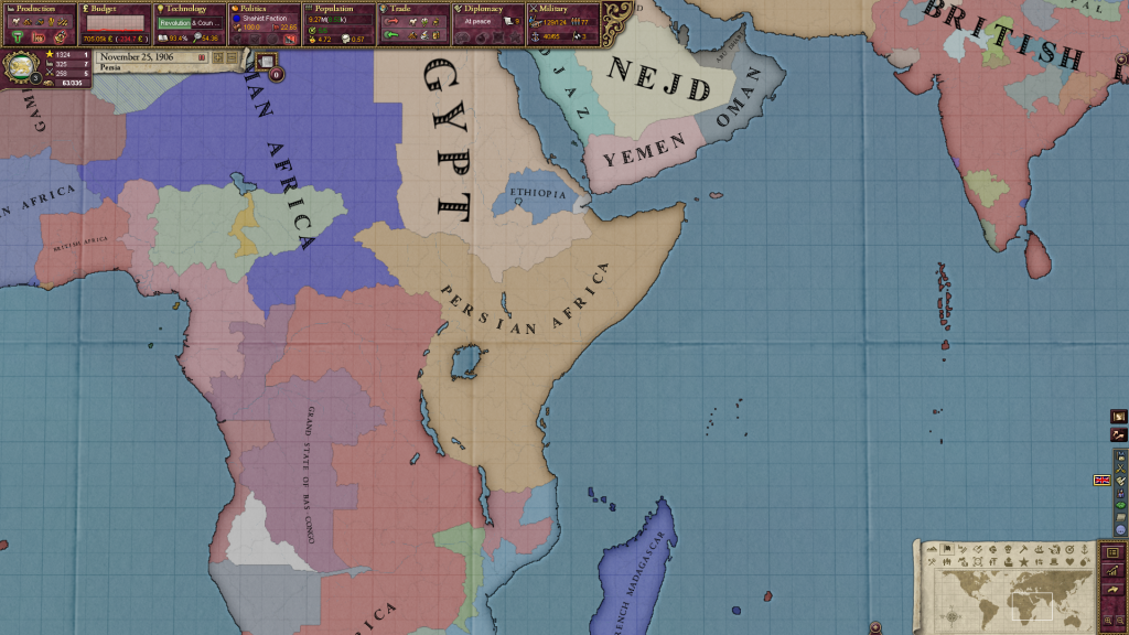 Australia became a GP and started to reconquer its inner cores, They did not have time to finish queensland though. In the end I was so powerful that every time I would support a side in a crisis, it would be solved in my favor. Since Russia dropped from GP I could not use a last great war against them to finish rounding the Black Sea, I needed Ekaterinodar and Georgia, and could not afford the 22 infamy...