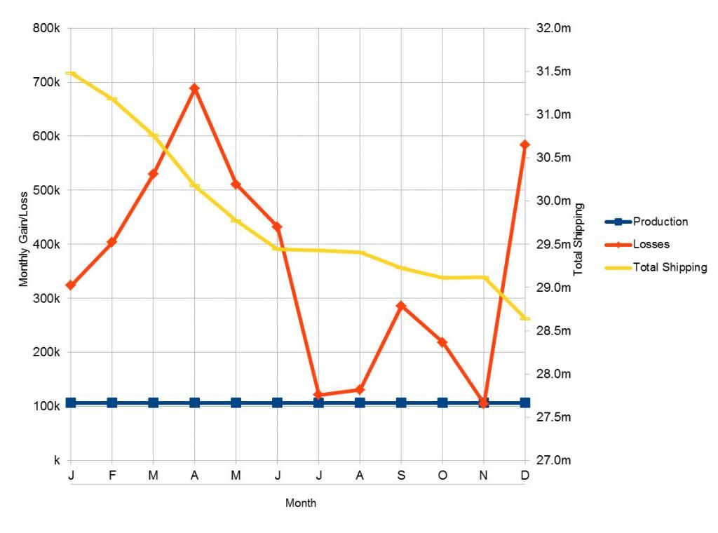 Looking back at the TFH strategic warfare graphs, I think it would be much more helpful to show estimates of enemy production and strength on the same graph, instead of just the losses (even if they are just estimates for numbers that you can't be certain of like enemy production). That way you can make a much better judgement of how your strategic warfare campaign is going.