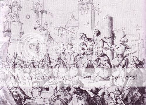 A romantic depiction of the execution (murder) of King Jean II of Cyprus. Soon after, Cyprus fell to the Roman invasion and Queen Charlotte was installed as regent of the island! Note the historical inaccuracy as it still shows a major portion of the island being Mamluk.