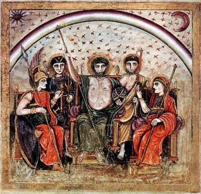A Greek Renaissance painting depicting Emperor John X, center, as the war god Ares. Flanked to his left is the goddess Athena and to his right, the goddess Hecate, the former patron of the city of Constantinople before its Christianization under Constantine and Theodosius of a bygone era. (note the crescent moon and star in the upper corners of the painting).