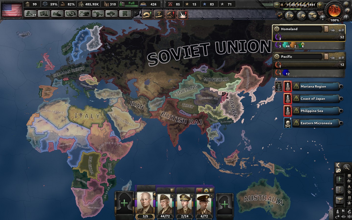 I was a year into a war with Japan. They, all by themselves, had more than 2x the amount of battalions (?? the units that go into making a division; e.g., 7 infantry + 2 towed artillery) than I did.